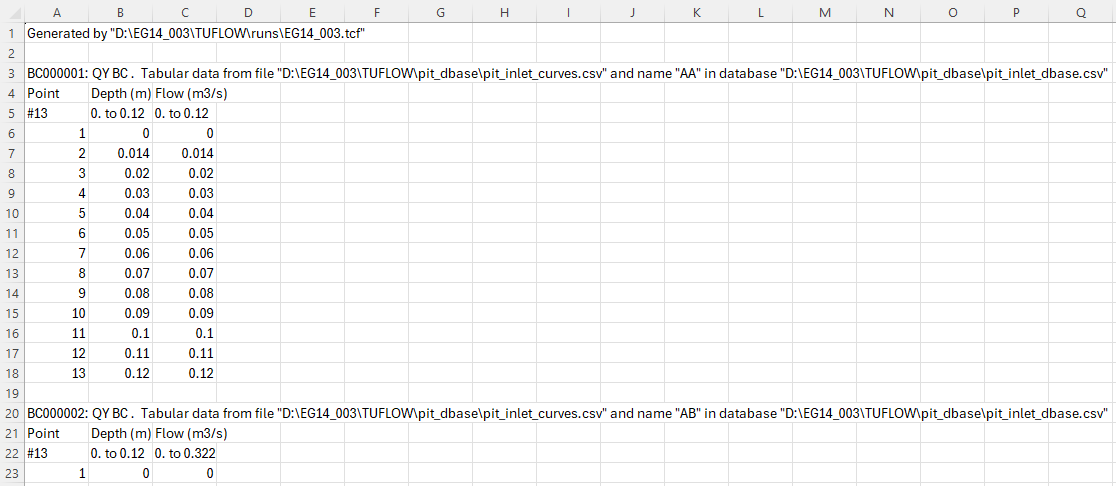 For each inlet curve a depth-flow table is produced as per the example image below: