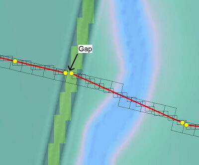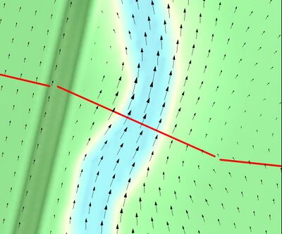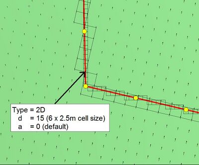 As previously mentioned, flow is transferred between both domains via a series of hidden 1D nodes. TUFLOW creates these at each vertex along the 2d_bc "2D" link line and also at a regular interval, as defined by the “d” attribute.