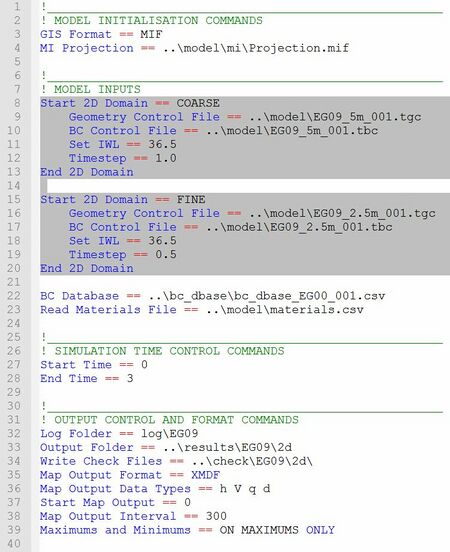 Multiple domain models are defined in TUFLOW using 2D domain blocks within the TCF file. Each domain block is defined using Start 2D Domain == <name> and End 2D Domain commands. Unique geometry control file, boundary condition file, initial water level, plot output and time step commands are defined within each domain block. All other commands (such as the boundary condition database, material file references, estry control file and simulation time and map output commands) are defined outside the above mentioned 2D domain blocks. An example TCF file is shown below. Line 8 to 13 represents the first 2D domain. Line 15 to 20 contain the second 2D domain block.