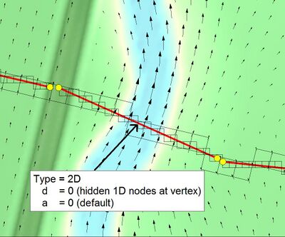- In regions of moderate to high velocity (>0.5m/s), manual vertex placement on the river banks and natural ridges in addition to a “d” value of 0 is common. Using a “d” value of 0 will create a hidden 1D node at each vertex along the 2d_bc “2D” link line. No intermediate hidden 1D nodes will be created.