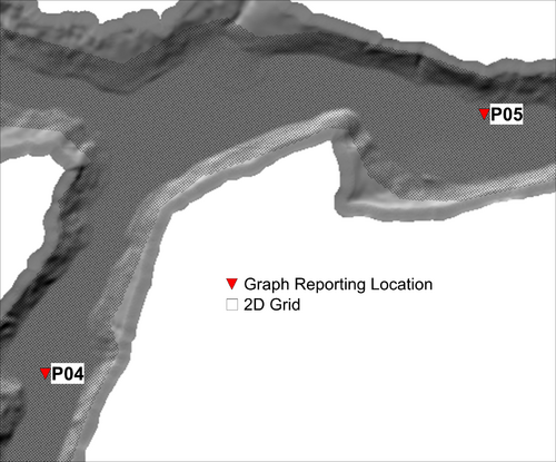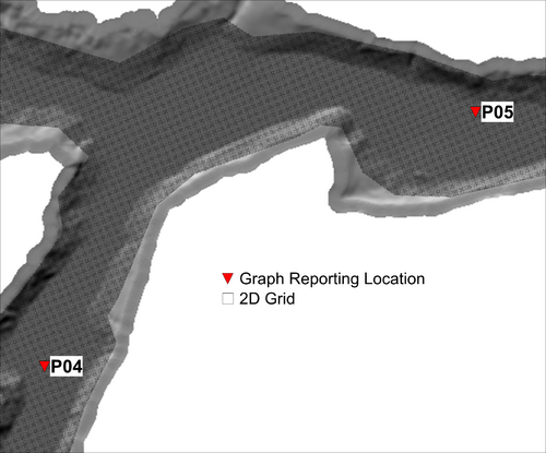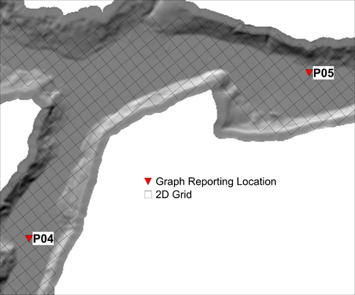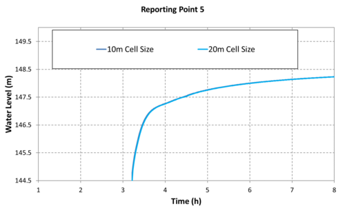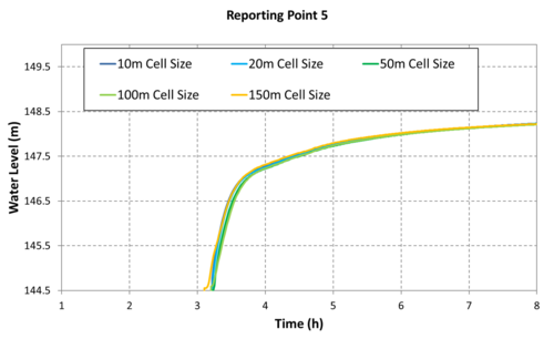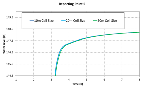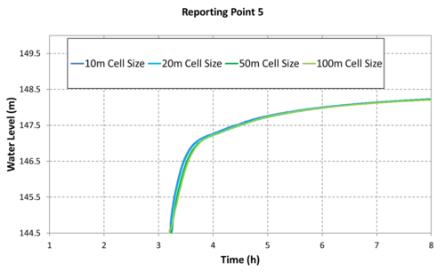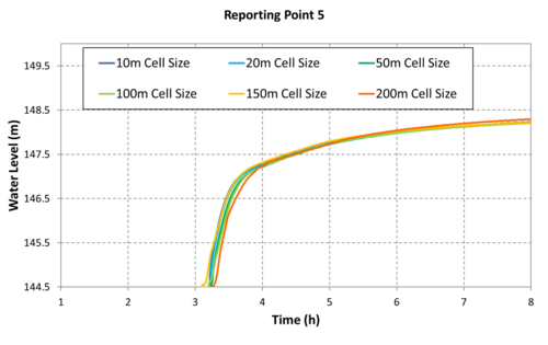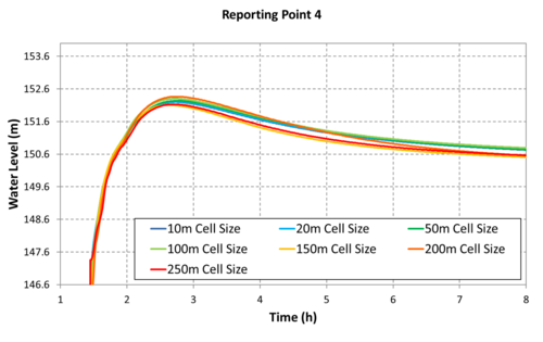 The graphed results indicate convergence is observed for all cases with a cell resolution equal to or less than 100m (328ft). The grid figures presented to the right of the graphs suggest the 100m cell resolution case has approximately (4) four cells laterally across the valley that the dam break flow is contained within. Although the 400-600m (1,300ft - 2000ft) wide valley isn't a traditional creek or river channel, the scale of flow associated with the dam break means the valley is behaving like one. Minor topographic features within the valley are too small to have a significant impact on the flood behaviour for flow conditions of this large magnitude. This result trend is consistent with the Australian Rainfall and Runoff (ARR) cell size recommendation for the flow in a channel, "In order to adequately resolve flow in a channel it is desirable to provide at least 5 grid/mesh elements laterally across the channel".