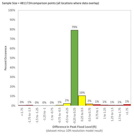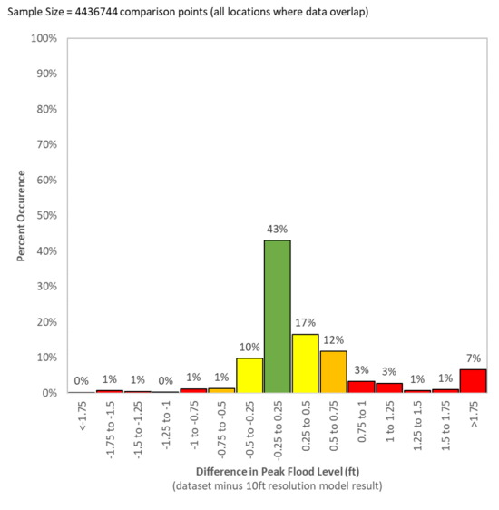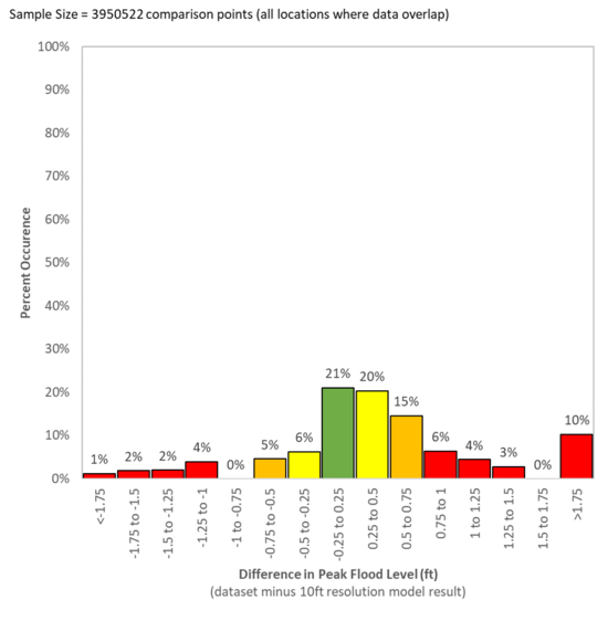 | '''Cell Resolution, Model Size <br> and Simulation Run Time''' || '''Difference in Water Level Result (ft)''' <br> (Relative to 10ft Resolution Model)<br> (Agreement Scale: Green = Excellent, Yellow = Good, Orange = Average, Red = Poor) || '''Sample Peak (Maximum) Water Level Result''' |