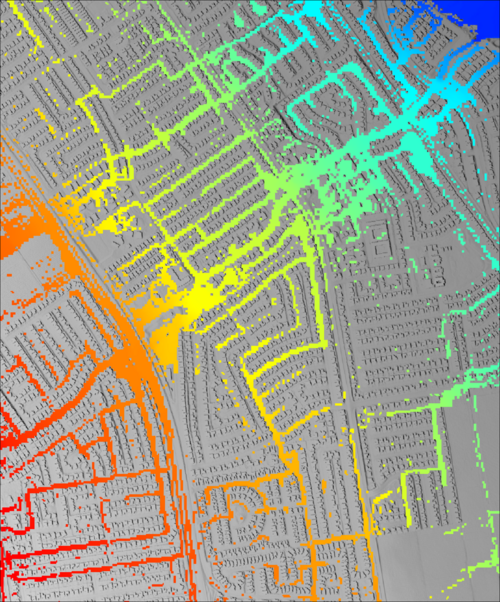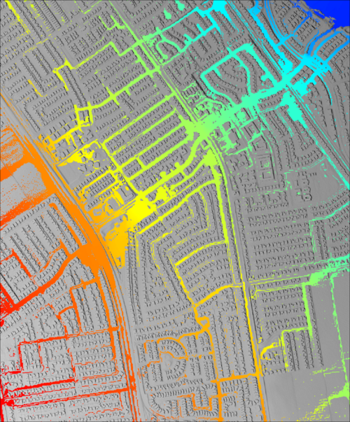| '''10ft (3.0m) cell size <br><br>5,821,533 total cell count<br><br> 9.2hr simulation run time'''||N/A <br><br>The histogram graphs below are calculated by subtracting <br>the peak (maximum) flood level result from the 10ft cell <br>resolution peak (maximum) flood level result <br>(shown to the right) || [[File:Mesh_Converge_Direct_Rainfall_10ft_002.png|500px]] |
