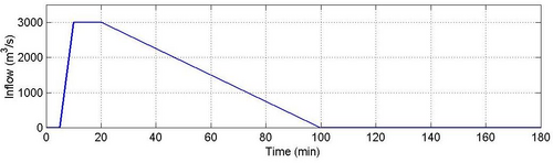 The model has a single inflow at the top of the catchment. The inflow hydrograph that has been used is shown below. Although the inflow only introduces water into the model for 100 minutes the model has been run for a simulation period of 30 hours. This was a requirement in the original EA model benchmark documentation.