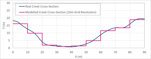This page of the TUFLOW Wiki discusses 2D cell size convergence. In well designed modelling software such as TUFLOW, cell size convergence refers to the tendency for model results to trend towards a common answer as cell size decreases. This behaviour occurs due to topographic features that influence the hydraulic flow behaviour better approximating reality as resolution increases. The series of creek cross-section images below demonstrate this. As model resolution increases from 20m to 5m the modelled topography progressively matches the real-world geometry more closely.