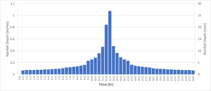 A direct rainfall approach has been used, applying rainfall directly to every cell within the model. The event hyetograph is a hypothetical 24 hour extreme event. The simulation duration has also been set to 24 hours.