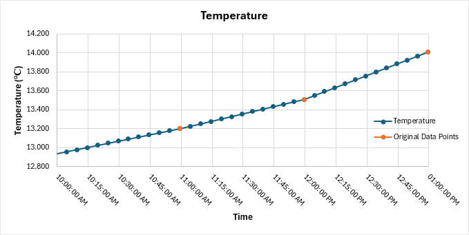 <li>Temperature has been provided as a timeseries with four input data points ('''temperature.csv'''). TUFLOW CATCH has interpolated these to produce temperatures at each timestep in the output timeseries file.<br> |