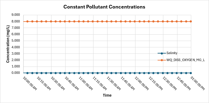 - Salinity and dissolved oxygen are constant pollutants. As such, their corresponding output values should be constant throughout the simulation.