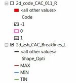 The files will be loaded using a predefined symbology for common TUFLOW input file types. This is determined using the prefix of the file name. The symbology for 2d_code and 2d_zsh files is shown below.<br> |