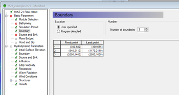 <li> Navigate to the <b>Basic Parameters</b> >> <b>Boundary tab</b><br>[[File: Mike21-BP-Boundary.png|350px|]] |