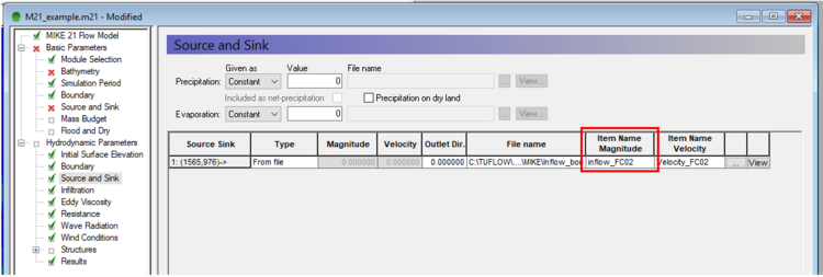 The location of source boundaries can be found in the MIKE21 control file (.m21) in the Basic Parameters >> Source and Sink tab. The location of the boundaries are specified as a point object using the local (j, k) coordinate system. These are required to be converted to absolute coordinates so an identical boundary location can be digitised in TUFLOW. The conversion process can be undertaken using identical steps as performed with converting upstream and downstream boundaries.