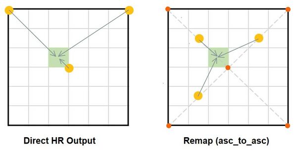 The direct HR output is based on a triangulation of the water levels at the cell centres and corners. In comparison, the remap function involves two interpolation steps. The first is the interpolation from the cell centres and corners to the grid map output locations (by default, half the cell size). Then, the asc_to_asc utility interpolates the water level output to the target DEM grids with fine resolution: