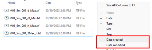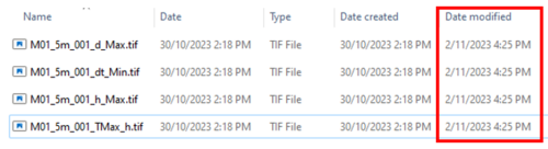 The GeoTIFF raster output is supported from the 2023-03 Release and onwards. It is considered an image by File Explorer and for some users, the 'Date' in file explorer defaults to show the 'Date Created' rather than the 'Date Modified'. If it appears that your results in the 'Results' folder (e.g. XMDF) are being updated however the results in the 'Results/grid' folder (e.g. TIF) aren't, this may be the reason.