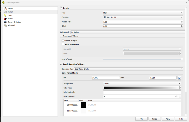- Within the 3D Map View window, configure the DEM to display as a 3D mesh: