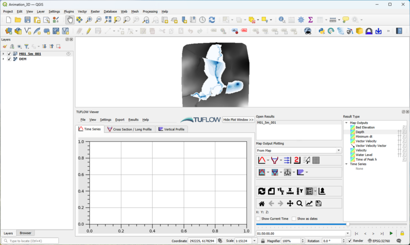 - Load the 2D results dataset using the M01_5m_001.xmdf results file located in the TUFLOW\results\ folder using the TUFLOW Viewer. For more details on loading map outputs, refer to TUFLOW Viewer - Load Results - Map Outputs.