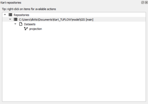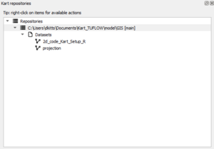Kart is a version control tool which stores geospatial data (and tabular data) in Git, providing a neat version control system whilst building TUFLOW models. Despite using Git, there is no requirement for the user to have a thorough understanding of Git, it's processes and commands. The Kart QGIS plugin provides user interface for Kart which provides some tools for reviewing changes to the geospatial data. This page describes a workflow for setting up a TUFLOW project, utilising Kart, and provides some of the benefits of using the Kart tools for version control.