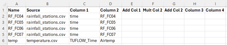 - Open the file. As this file will be read by TUFLOW CATCH, the first column must contain the date in ISODATE format (DD/MM/YYYY hh:mm:ss). It will also be read by TUFLOW HPC, and therefore must have a column specifying a time in hours from the beginning of the model. In this case, the 'TUFLOW_Time' column contains the time in hours. For example, 01/01/2021 10:00:00 corresponds to 0, 01/01/2021 11:00:00 to 1, and so on.