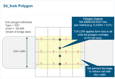 • Polygon features will distribute the form loss between multiple cells across the width of the bridge and across the waterway. Due to this, the TUFLOW form loss input should be entered as the total value per unit width in the direction of flow (eg. FC = 0.2/20m = 0.01).