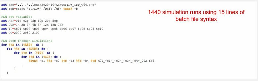 Note: The 'AEP' and 'DUR' are user defined batch file variables. Projects may use different variable names. The 'AEP' refers to an event magnitude (Annual Exceedance Probability) and 'DUR' refers to an event duration.