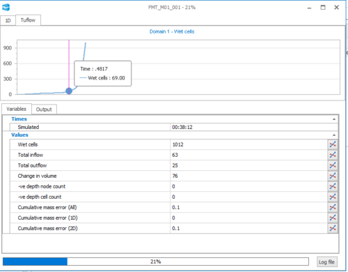 When the simulation is running, the Flood Modeller status window will open. Flood Modeller will then open a tab with the TUFLOW output.