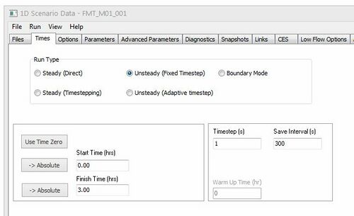 - On the 'Times' tab, we will replace the simulation time parameters that were removed from TUFLOW. Enter the following parameters: