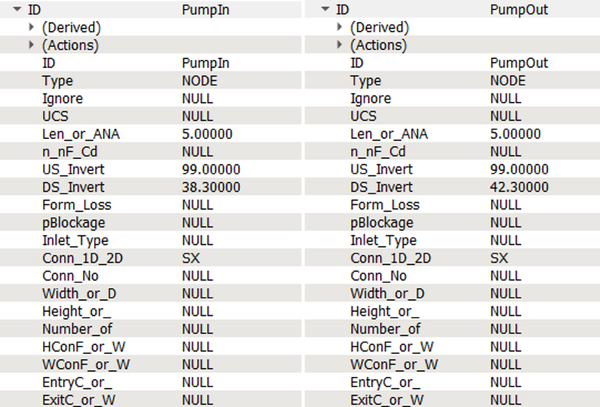 As pumps are zero length channels, they do not create automatic nodes at the upstream and downstream end. If you ran the model with just a pump polyline and SX connection, you will get ERROR 1353. To remove this error, the most efficient schematisation is to digitise a 1d_nwk 'NODE' at the upstream and downstream end of the pump (no need for a separate 2d_bc SX layer). Unlike NODEs connected to pipes and channels, NODEs connected to zero length pumps require the following attributes: