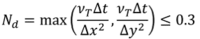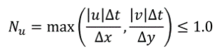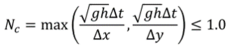 where: u is the X-velocity, v the Y-velocity, Δt is the timestep, Δx and Δy are the cell dimensions, g is acceleration, h is water depth and νT is Turbulent Eddy Viscosity. These Control Numbers are kept below 1.0, 1.0 and 0.3, respectively, to stabilise the HPC solver.