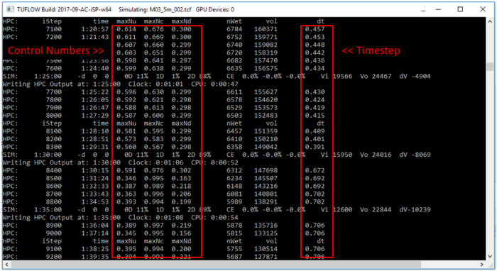The console window below highlights the control numbers and resulting simulation timestep value as for the above simulation. These values will vary during the computation depending on the hydraulic conditions.
