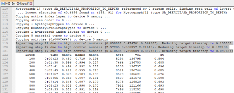 - Open the HPC simulation log files (M03_5m_004.hpc.tlf). Review the model timesteps at the beginning of the simulation. Numerous repeat timesteps should be reported. This highlights instances where TUFLOW HPC had to reduce its step size to remain stable. This is symptomatic of challenging hydraulic conditions and is worth investigation.