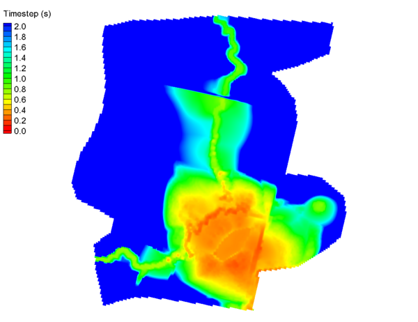 - Similar to the topography example, the location within the model that is causing the timestep reduction can be identified by viewing the "dt" Map Output results. Open the simulation results in your preferred viewing software. It can be seen that the location of minimum timestep aligns with the feature we used to define the initial water level. In a real-world project, the above information datasets should be sufficient for a modeller to recognise there is an issue with the model inputs and what the cause is.