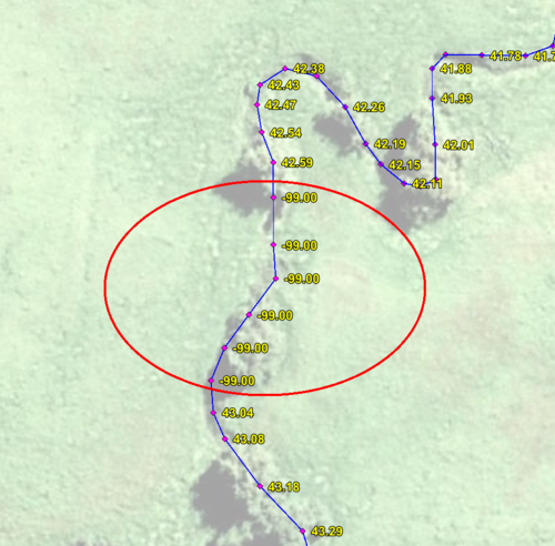 - The above images are provided as it is important to set the correct breakline type. For example if a creek was represented with a "thick" gully line, the changes to the model elevations (Zpts) might not necessarily provide a continual flow path. In the example below, the "thick" breakline is shown, however as flow cannot move diagonally between cells, this would be unsuitable for a creek centre line.