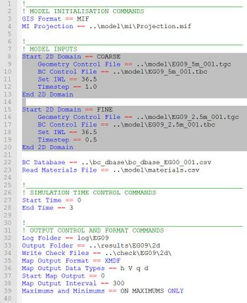 Multiple domain models are defined in TUFLOW using 2D Domain Blocks within the TCF file. Each Domain Block includes unique geometry control file, boundary condition file, initial water level and time step commands. All other commands (such as the boundary condition database, material file reference and simulation time commands) are defined outside the above mentioned 2D Domain Blocks. An example TCF file is shown below. Line 8 to 13 represents the first 2D domain. Line 15 to 20 is the second 2D domain block.