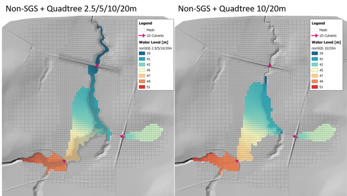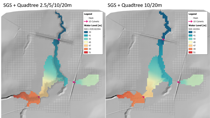 The example below shows that a Quadtree model with 10/20m cell size (right) can convey water as smoothly as a 2.5/5/10/20m model along the narrow and meandering gully line.