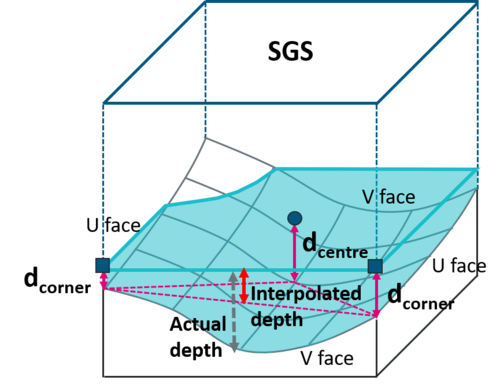 In TUFLOW, the depth output is interpolated from the depths at the nearest cell centre and cell corners surrounding the output grid. Because TUFLOW currently doesn't store the underlying high resolution DEM values other than those needed for the SGS hydraulic computations, the interpolated depth may not perfectly represent the actual depth as illustrated in the figure below.