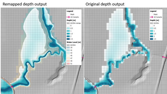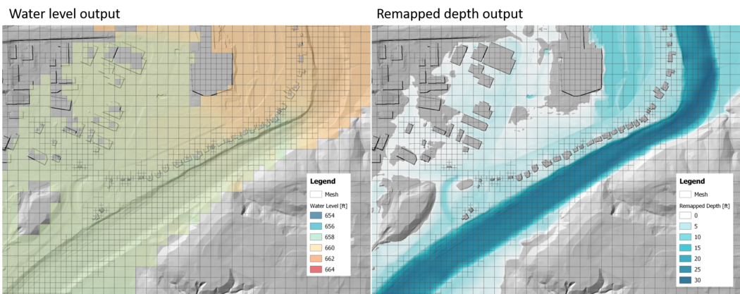 Figure 6 Water level output and remapped water depth in a river flood model.
