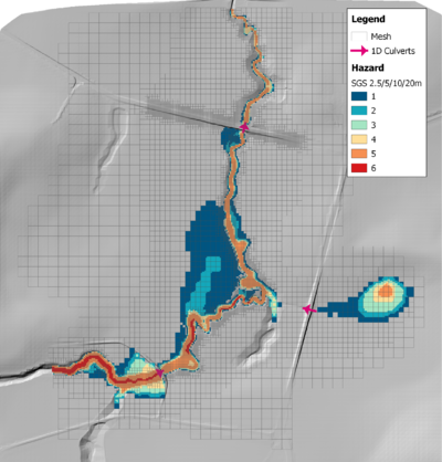 The figure below shows the hazard output from the 2.5/5/10/20m model, and as can be seen the hazard result is much smoother and more accurate along the gully where the finer cell sizes occur.