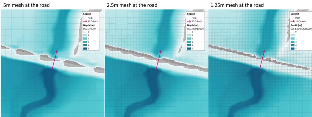 When water flows over a road crest, the remapped water depth may become negative if the output grid size is coarse. The figure below shows the remapped depth over a road crest from models with mesh sizes ranging from 5m to 1.25m. As can be seen, some areas don't have remapped depths despite the water clearly over-topping the road.