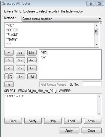 - Select all the "HX" lines from the 2d_bc_M04_HX_001_L layer. To do this use open the attribute table for the layer (right click on the layer in the Table of Contents and select Open Attribute Table. Use the select by attribute option to select all lines with "Type" equal to "HX".