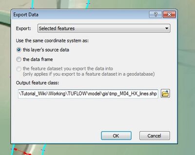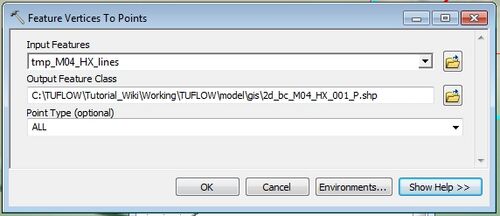 In the export dialogue ensure that export Selected Features is selected. - Next we need to convert the vertices along these lines to points. This process uses the Feature Vertices To Points functionality. To open this select this from the toolbox. This is located under Data Management >> Features >> Feature Vertices To Points. Select the tmp_M04_HX_lines as the input layer (HX lines only). Once again this is a temporary file, set the output name as tmp_M04_HX_pointsand output this to the TUFLOW\model\gis\.