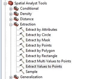 - The next step is to inspect the elevations from the DEM. To do this from the toolboxes select, Spatial Analyst >> Extraction >> Extract Values to Points.