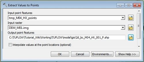- Set the input layer as the intermediate tmp_M04_HX_points layer containing the points and the input raster as the DEM. Set the the output name as 2d_bc_M04_HX_001_Pand output this to the TUFLOW\model\gis\. This output file will be inputted to TUFLOW.
