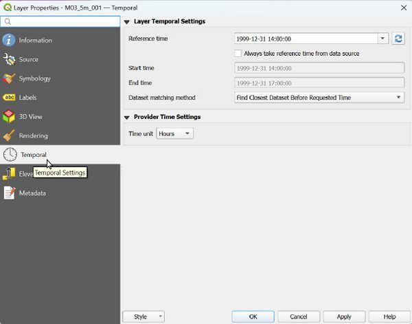 For QGIS v3.16+, the reference time for map outputs is controlled natively in the layer's Properties. For TUFLOW Classic and HPC simulation results, this will most likely default to 1999-12-31 14:00:00. TUFLOW FV outputs can contain a reference time specified in the .fvc file and may be correctly set on load.