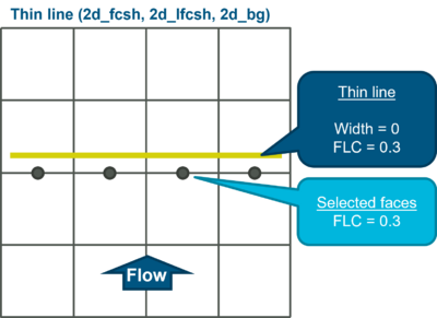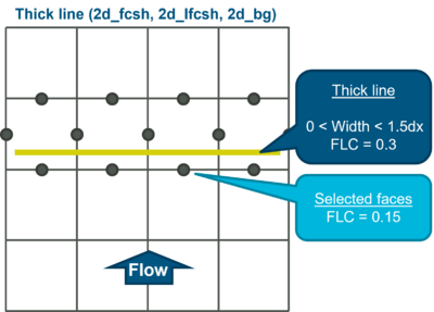 - Wide line (only supported for 2d_lfcsh, width attribute larger than 1.5 times the cell size) - The FLC attribute is a portion of the total loss based on number of cell sides in the predominant direction of flow. Caution should be taken when using a "wide" line due to the fact changes in cell size can trigger the need to recalculate and define losses.
